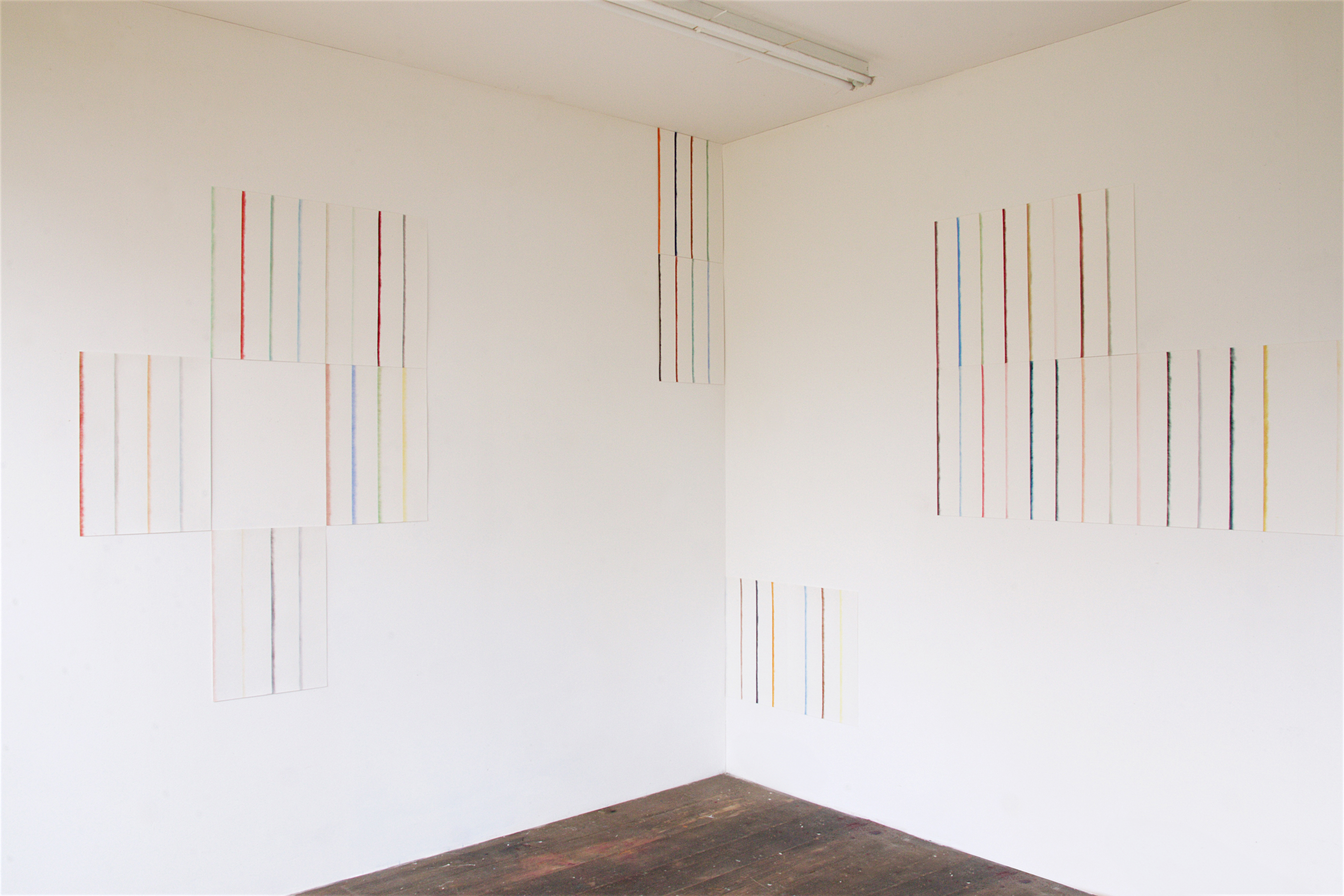 The simple vertical lines, when seen from afar, transform into a pattern of short horizontal strokes rubbed with the thumb as the viewer approaches. The traces of the action are tangible in the work and create an entirely different (physical) connection with the viewer. In this, lines are not lines but an impetus for a plane. The variable nature of the sheets allows one to respond to the surrounding space and situation, and no two installations will ever be the same.